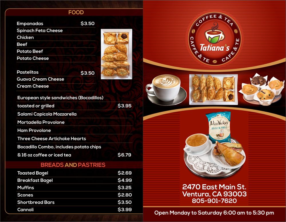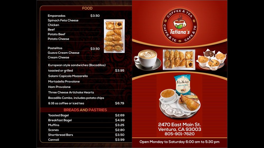Tatiana's Coffee and Tea is a Latinx-owned and women-owned cafe located at 2470 E Main St Ventura, CA 93003. Their menu features a diverse selection of coffee, tea, and alcoholic beverages, along with Latin-inspired snacks and pastries. The cafe offers takeout, delivery, and catering services, making it convenient for customers on the go. With a cozy outdoor seating area, free Wi-Fi, and gender-neutral restrooms, Tatiana's is an inclusive and welcoming space for all. What sets them apart is their commitment to sustainability, offering plastic-free packaging and allowing customers to bring their own containers. Whether you're looking for a quiet spot to work or a place to catch up with friends, Tatiana's Coffee and Tea has something for everyone.